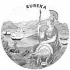 The word Eureka ("I have found it") appears above the goddess Minerva seated with shield and spear. Oddly tiny Grizzly bear in foreground. Miner works beyond. Ships in bay and mountains in distance