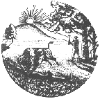 The seal shown is the first official seal and dates from 1963. Earlier seals are hard to find but contain the same general elements dating back to the 1870s on railroad certificates. Primary elements include a bison running right to left while a woodsmen chops a tree at right. The sun appears beyond, behind rolling hills