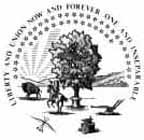 Eagle with shield holds ribbon in beak that reads "State sovereignty, National union." Rising sun beyond. Dates of territory and statehood status on rock. Unlike most states, the official Illinois seal has changed substantially since territorial times. The current seal from 1868 is the only one to show the sun.
