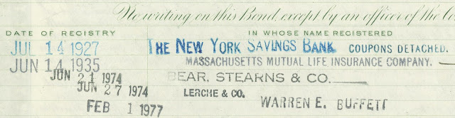 Shown below is part of the transfer panel on the back of a $1000 general mortgage bearer bond issued by the Cleveland Cincinnati Chicago & St Louis Railway in 1893, more popularly known as the 'Big Four.' The New York Central acquired control of the Big Four in 1906. While certainly underwritten by the giant New York Central, the company made its own interest payments on bonds like this and the company was a solid investment well over half a century. Between 1893 and 1927, the ownership of the bond is entirely unknown. However, the New York Savings Bank came into possession of the bond at some time during that period and converted it to registered status in 1927. During conversion, the bank surrendered all the coupons and thereby registered its interest payments with the railroad company. It appears the bank held the bond through the 1929 stock market crash and the worst of the Great Depression before selling it to Massachusetts Mutual Life Insurance in 1935. That company owned the bond for the next 39 years, during which time the New York Central merged with the Pennsylvania Railroad. The resulting Penn Central filed for bankruptcy protection in 1970, and Mass Mutual ultimately sold the bond to Bear, Stearns & Co. in 1974. Bear, Stearns re-sold the bond six days later to Lerche & Co. which held the investment for three more years. By that time, the bankruptcy had long been in litigation and the value of bonds like this dropped to around $40. A favorable outcome for investors was highly uncertain. Lerche & Co. ultimately sold the bond to Warren Buffet in 1977. The bond was retired and cancelled November 3, 1978, presumably as part of the Penn Central Transportation Company's bankruptcy court agreement of August, 1978. We don't know how much Buffet might have paid for the bond, but one can surmise he did not lose money.