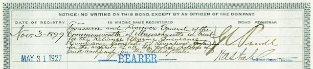 The New York Central & Hudson River Railroad Company issued this $1000 gold mortgage bond in 1897. After an unknown ownership for two years, the Commonwealth of Massachusetts registered this bond as an investment held in trust for the Marine Insurance Company of Liverpool. The bond stayed in the trust for the next 29 years, presumably netting $1,105 in interest. At that time, the new buyer converted the bond back to bearer status. Its history turned dark again and there is no record of who or what might have owned this bond during the Central's merger with the Pennsylvania Railroad in 1967, the bankruptcy of the Penn Central in 1970, or acquisition by Conrail in 1976. Whatever the case, the bond was ultimately retired, on Oct 31, 1978, only three days before Buffett's bond above, and probably for a similar amount. Once cancelled, it lived in the Penn Central archives until John Herzog convinced the Penn to sell its old paper securities instead of incinerating everything. Chances are, the bond sold as part of a large lot in a NASCA/Smythe sale in 1987 or 1988. I ultimately acquired the bond from Clinton Hollins in 2005.
