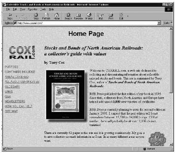 After a long time planning, I finally have my web site up and running. It is dedicated entirely to information about collectible stocks and bonds. If you are online, please visit the site at www.coxrail.com.