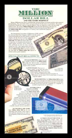 These notes were printed for an organization called the "International Association of Millionaires "(IAM). When initially released in 1988, IAM sold these notes for around $25 each. At that time, the notes were accompanied by a certificate of authenticity and a full-color explanatory brochure shown at left.