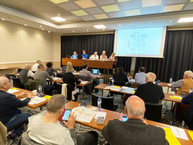 Auctioneer and participants at the Mario Boone (Centrum voor Scripophilie) auction and bourse held in Antwerp, Belgium, October, 2021