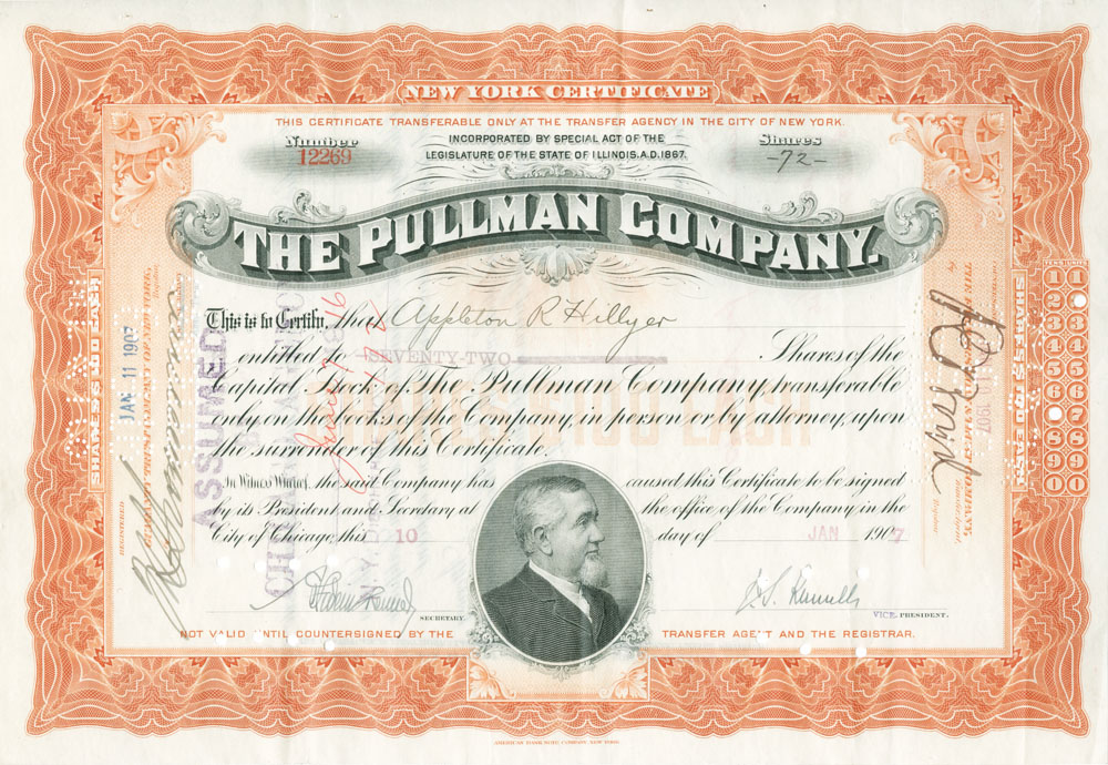 Below is a list of data I have stored for a single certificate chosen at random (Pullman Company stock certificate, shown above).