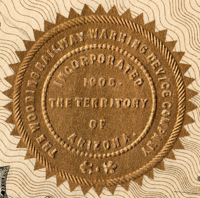A moderate percentage of embossed corporate seals display locations of incorporation. Many embossings were flattened by extended handling or compressed storage. If the wording on embossed seals is hard to read from the front, flip the certificate over and look on the back. In extreme cases, seals may need to be held obliquely to bright lights.