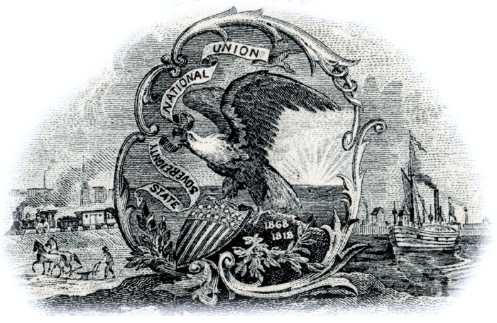 Engraved vignettes of state seals were sometimes used to show places of incorporation in place of clear wording. When state seals appear on certificates, they are excellent confirmations that companies were incorporated in that, or multiple, states. Unfortunately, less than one percent of identified varieties show state seals and most of those came from Pennsylvania, New Jersey, New York, and other northeastern states.