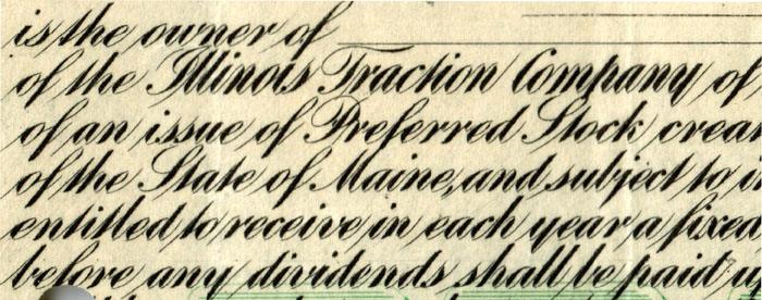 Some companies chose not to dedicate much space to their incorporation locations, and merely embedded that information within other text. This was especially true with bonds. While some companies placed location names near the top borders of their bonds, many displayed their locations in the first few lines of text. In this case, the text shows that the Illinois Traction Company was incorporated in Maine.
