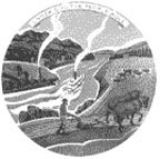 An intricate design with the quintessential Kansas farmer plowing in the foreground. Beyond is a wagon train heading west. Riverboat, cabin, and a herd of tiny bison. Ad astra per aspera ("To the stars through difficulties") above a double arch of 34 stars.