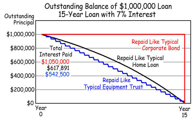 This chart clearly shows that serial bonds repay principal the fastest. In doing so, serial bonds (ETCs) also spend the least on interest over the same 15-year period. Moreover, investors tend to consider those kinds of loans as safer investments, very much less prone to vacilations of the stock and bond market.