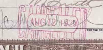 Dates of cancellation are normally important only when they reflect days of historical importance (i.e. bombing of Pearl Harbor, 1929 Crash of Wall Street, VE day, etc.) Small numbers of specialists also appreciate cancellation dates important to specific company events or days in the lives of certificate owners. A small number of certificates are dated within cancellation stamps as in the example below.