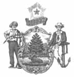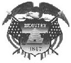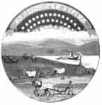 A plow surrounded by the words "Agriculture" and "XVI" (for 16th state) at top and a ship with sails down with the word "Commerce" below.