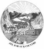 Conestoga wagon pulled by oxen above "The Union." Plow and pick in the foreground. Tree and ship (representing a departing British warship) in distance. Eagle above. Surrounded on the bottom by 33 stars.