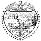 The strong allegorical designs and the heavy number of incorporations in New York have made this seal the second most imitated on U.S. railroad stocks and bonds. Liberty with staff and Liberty cap stands at left. Justice with scales stands at right. On the shield between is a view of ships on the Hudson River and the Hudson Highlands beyond. Eagle and globe above shield. Excelsior ("Higher") below shield.