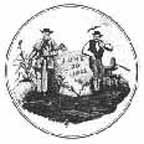 Shield with sheaf of wheat and ear of maize above ox. Ship under full sail above. Farmer left, rifleman right. Banner below reads "Liberty and Independence."