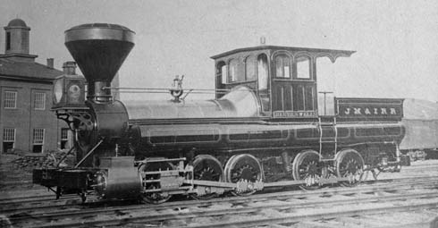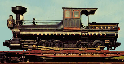 This image at top the Reuben Wells on a Pennsylvania Railroad flat car. The image came from a post card and I removed the distracting background so you can see the shape of the locomotive more clearly. In this photo and in photos of the current display, the Reuben Wells carries a mushroom smokestack.