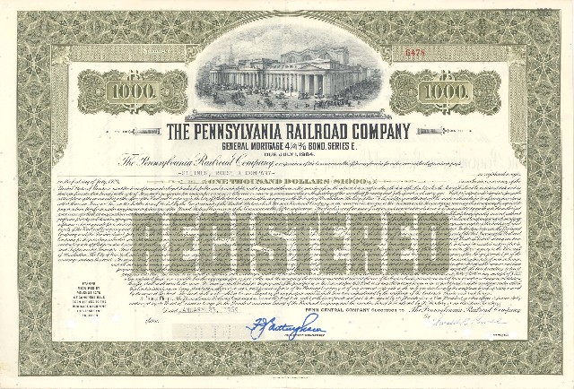 The New York Central & Hudson River Railroad Company issued this $1000 gold mortgage bond in 1897. After an unknown ownership for two years, the Commonwealth of Massachusetts registered this bond as an investment held in trust for the Marine Insurance Company of Liverpool. The bond stayed in the trust for the next 29 years, presumably netting $1,105 in interest. At that time, the new buyer converted the bond back to bearer status. Its history turned dark again and there is no record of who or what might have owned this bond during the Central's merger with the Pennsylvania Railroad in 1967, the bankruptcy of the Penn Central in 1970, or acquisition by Conrail in 1976. Whatever the case, the bond was ultimately retired, on Oct 31, 1978, only three days before Buffett's bond above, and probably for a similar amount. Once cancelled, it lived in the Penn Central archives until John Herzog convinced the Penn to sell its old paper securities instead of incinerating everything. Chances are, the bond sold as part of a large lot in a NASCA/Smythe sale in 1987 or 1988. I ultimately acquired the bond from Clinton Hollins in 2005.
