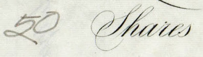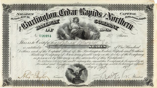 This is a curious handwritten denomination on an 1879 Burlington, Cedar Rapids & Northern Railway Company certificate that first looked like a fifty-share, then a twenty, and then a fifty.