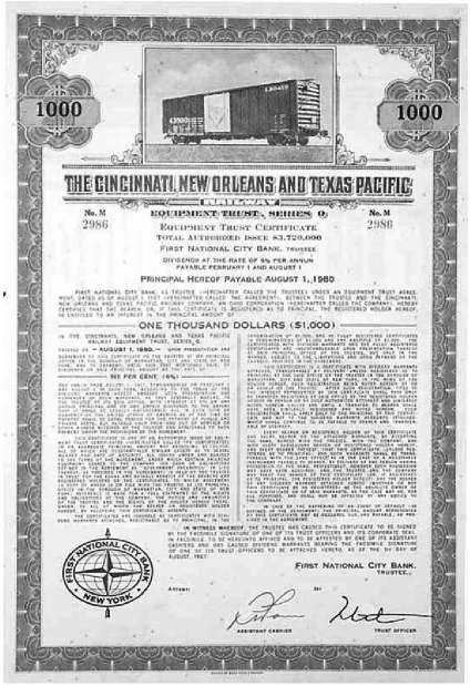 One of five certificates currently known from The Cincinnati New Orleans & Texas Pacific Equipment Trust. Labeled series O. Does that mean we should find fourteen series before this one? The database lists 219 certificates from trusts. The top three companies with the most known certificates are the Seaboard Air Line Railway (25), the L&N Railroad (15) and the Seaboard Coast Line Railway (12). Illustration courtesy of William Knadler.