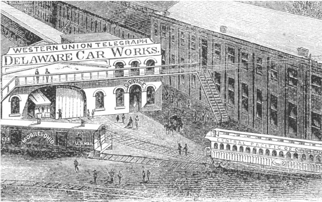Closeup of the Jackson & Sharpe “Delaware Car Works” at Wilmington, Delaware in about 1872. At the time this woodcut was made, the plant covered about 8 acres, and produced more cars than any other plant in the U.S. It was purported to have over a million board feet of lumber on the ground at any one time, to keep up with as many as sixty cars in simultaneous production. At right is a finished passenger car for the Central Pacific Railroad. At left is a Mobile & Ohio mail/baggage car. A few, very rare stock certificates from this company are known. (Woodcut engraving from The Great Industries of the United States, 1873)