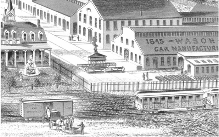 Part of an 1872 view of the Wason Car Manufacturing Company of Springfield, Mass. from an engraving by J.N. Allen. No certificates yet known for this company.