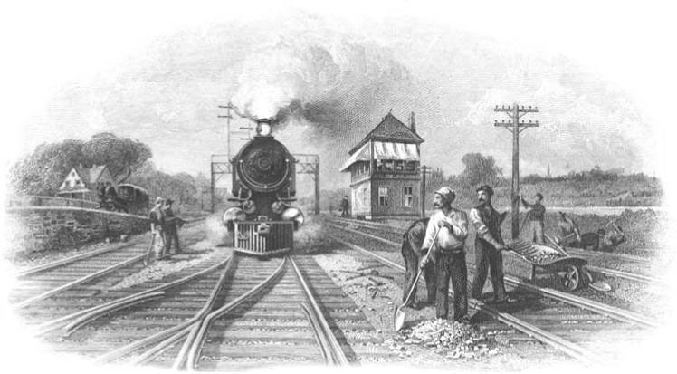 An ever-popular image of a steam locomotive approaching trackworkers. Eleven people are visible, including the driver in a horse-drawn buggy in the left distance. This vignette is from 1907 bonds of The Michigan Central Railroad Company, engraved by American Bank Note Co.