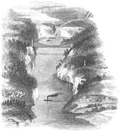 View of the Niagara River Gorge, replete with a RAINBOW! below the falls. This 2” tall vignette was engraved by Rawdon Wright & Hatch. It appears on New-York Central Rail Road Company bonds from 1853.