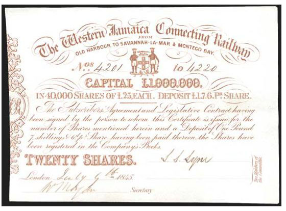 A plain, but seemingly scarce British-issued certificate from The Western Jamaica Connecting Railway, 1845.