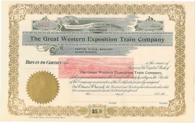 Certificates are currently known only in unissued form. The company was incorporated in Colorado and its certificates were printed by A.S. Carter Stamps, Seals and Printing of Denver.