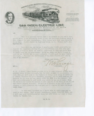 Here is an interesting page sent by a Mr. Corey Phelps, a long-time collector. It is a hand-typed letter on letterhead from the Minneapolis St Paul & Dubuque Electric Traction Co. This was the "Dan Patch Electric Line" tirelessly promoted by Marion Savage and named after his famous race horse. (The horse owned the world pacer record for either 32 or 54 years, depending on information source.)