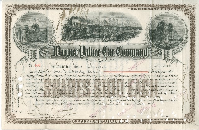 Wagner Palace Car certificate cancelled four ways: handwritten, rubber-stamp, circular punches and punches shaped like the letter 'P'.