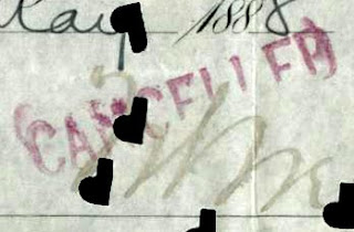 Less obvious are "cut cancellations" made by special, dedicated cutting devices. From the front, cut-cancelled certificates often look completely intact, but pick one up and your fingers poke through slits in the paper. These are particularly worrisome because eBay sellers frequently "forget" to describe these.