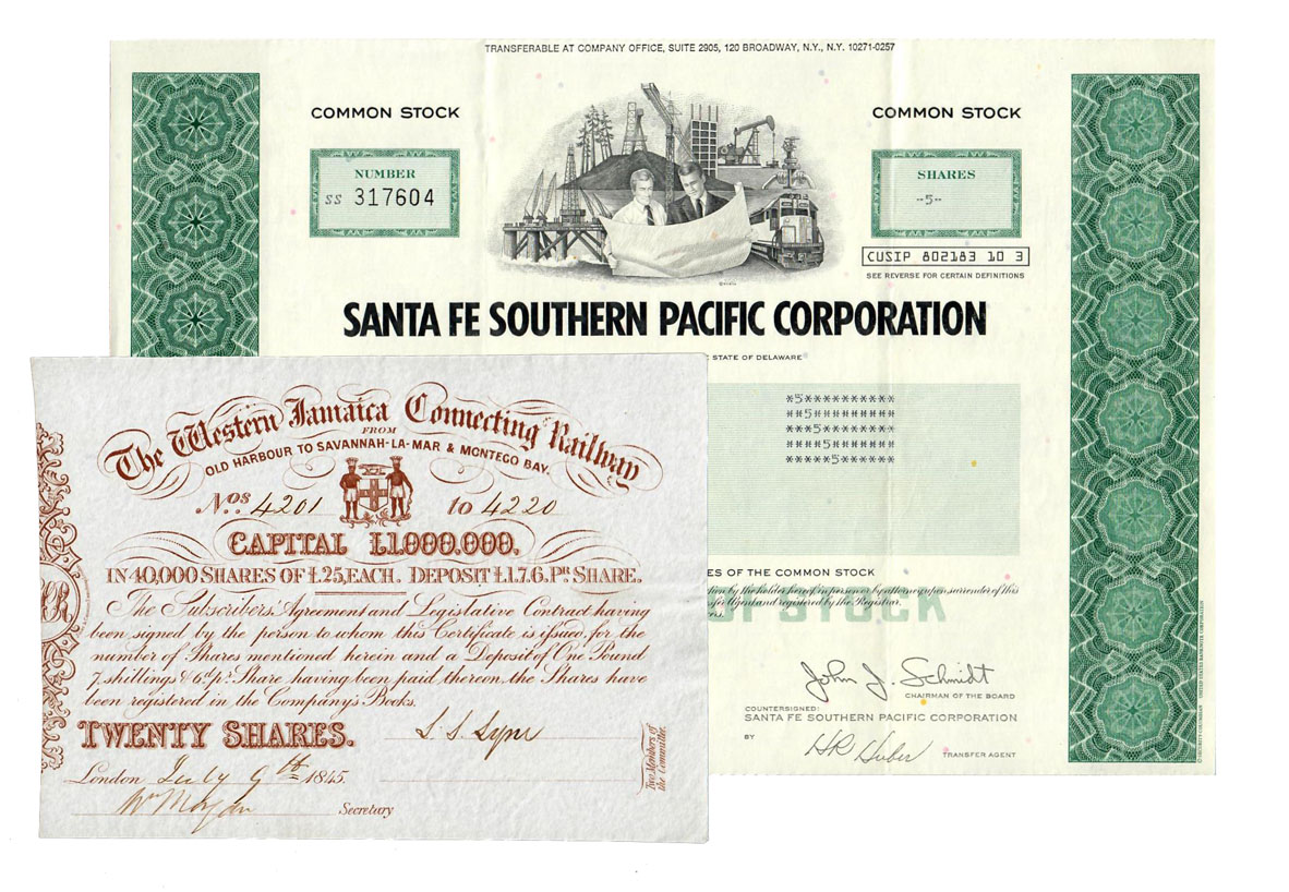 The Penn Central stock certificate below is sufficiently thick to avoid problems even though the paper has a slight ivory tint and there is text on the back. When compared to George's catalog, only the barest hint of yellow is visible, but it is no more obvious in the scan than on the certificate itself.