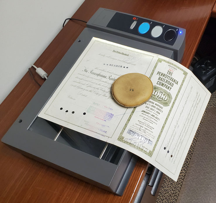 Horizontal format bond of the Pennsylvania Railroad being scanned in two pieces on small Optibook "bookedge" scanner. (Scanner cover removed.) Note: top of bond faces the same direction in both scans. Map weights help keep certificate flat.