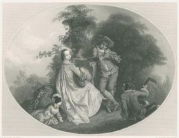 ![]() The GardenAttribution on print:"H. Bourne, Engraver" Size of Bourne engraving: 8.5 x 6.5 in (21.5 x 16.4 cm) Estimated date engraved: about 1854 Source of print: Art Journal, July, 1854 Printed by: G. Virtue Title of source painting: unknown Painter: (Jean)-Antione Watteau Probable date of source painting: unknown Current location of painting: unknown Note: The British Museum acquired a copy in 1872. Rarity 4 based on sales appearances (on a scale of 1 to 8). This print is somewhat common (offered about three times per year).