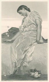 ![]() The Knuckle-Bone PlayerAttribution on print:"Engraved by H. Bourne" Size of Bourne engraving: 5.9 x 10.1 in (15 x 25.7 cm) Estimated date engraved: about 1885 Source of print: Art Journal, April, 1884. Printed by: J.S. Virtue & Co. Title of source painting: variably referenced as The Knuckle-Bone Player and The Knucklebone Player Painter: Lord Frederic Leighton Probable date of source painting: 1867 Current location of painting: The study for this painting is at the Bewdley Museum, Worcestershire. Note: The original painting was exhibited in London at the Royal Academy in 1867. It was offered in Sotheby's sales in 1976 and 1977. It later appeared in an Oct. 24, 2006 sale at Sotheby's (lot 208) where it was estimated at $600,000 to $800,000. Rarity 4 based on sales appearances (on a scale of 1 to 8). This print is somewhat common (offered about three times per year).