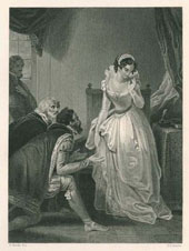 ![]() Flagstaff and Anne Page (aka Mrs Ford)Attribution on print:"H. Bourne, Engraver" Size of Bourne engraving: 7.6 x 9.3 in (19.3 x 23.7 cm) Estimated date engraved: before 1872 Source of print: Art Journal, May, 1853 (pub. George Virtue.) Also appears in Imperial Edition of The Works of Shakespeare, Volume 1, by Charles Knight, 1873 (Virtue & Yorston, New York) Printed by: unknown Title of source painting: unknown Painter: George Clint Probable date of source painting: 1831 Current location of painting: unknown Note: Engraving represents act 3, scene 3 in Shakespeare's Merry Wives of Windsor. Some examples of the print are known labeled Falstaff and Mrs. Ford . The British Museum acquired a copy in 1872. Rarity 2 based on sales appearances (on a scale of 1 to 8). This print is very common (offered about one time per month).