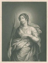 ![]() St AgnesAttribution on print:"H. Bourne" Size of Bourne engraving: 3.9 x 5.1 in (9.9 x 12.9 cm) Estimated date engraved: unknown Source of print: The Lives of the Fathers, Martyrs and Other Principal Saints, by Rev. Alban Butler Printed by: Virtue and Yorston Title of source painting: St Agnes Painter: Domenichino (Domenico Zampieri) Probable date of source painting: 1620 Current location of painting: Royal Collection Note: This image is an abbreviated form of the original which shows a standing St Agnes in a classical setting with a child and lamb at her feet. This engraving is also a well-executed mirror image of the original. A chalk study of this image is located in Windsor Castle. Rarity 6 based on sales appearances (on a scale of 1 to 8). This print is scarce (offered about one time every two years).